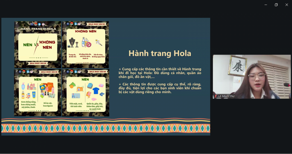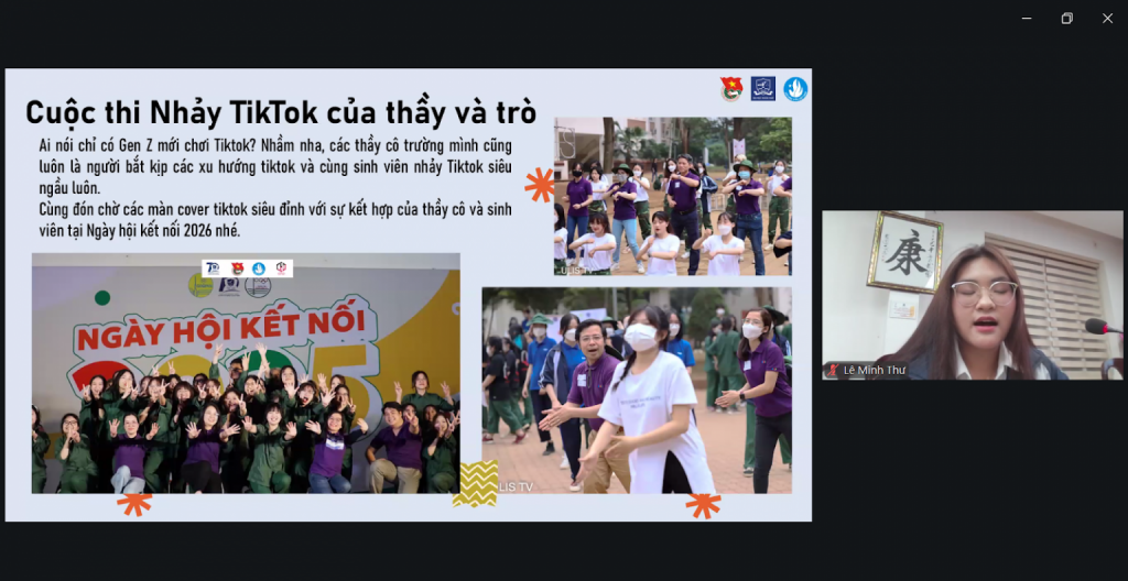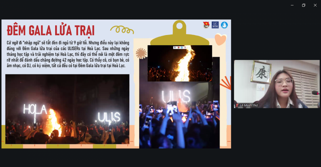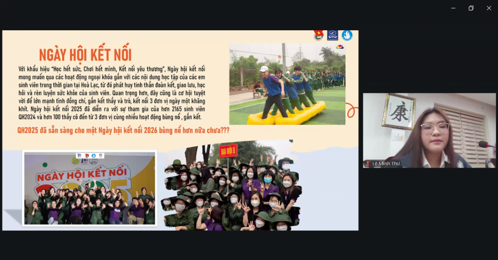 Nối tiếp chương trình, đại diện Đoàn Thanh niên – Hội Sinh viên Trần Thị Phương Thanh đã giới thiệu những hoạt động sôi nổi và thú vị sẽ được tổ chức dành cho các bạn sinh viên trong thời gian học tập tại Hoà Lạc, bao gồm: Hola Nhật Báo; chương trình Ngày hội kết nối & Thanh niên khỏe; cuộc thi Lớp tôi là số 1…