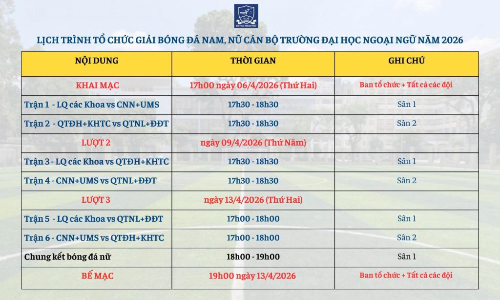 Theo kết quả bốc thăm, giải đấu sẽ chính thức khai mạc vào 17h00 ngày 06/4/2026 tại sân bóng đá Khu liên hợp thể thao của Trường. Các lượt trận vòng bảng diễn ra vào các ngày 06/4, 09/4 và 13/4/2026. Trận chung kết bóng đá nữ dự kiến tổ chức vào 18h00 ngày 13/4/2026, ngay trước lễ bế mạc diễn ra lúc 19h00 cùng ngày.