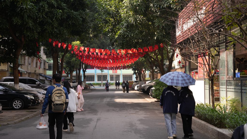 Từ các khu vực sinh hoạt chung đến những góc nhỏ quen thuộc, không gian ULIS trở nên sinh động với những tiểu cảnh Tết được chăm chút kỹ lưỡng. Nổi bật lên những sắc đỏ của câu đối, sắc đào điểm xuyết khắp lối đi, hòa cùng ánh nắng đầu năm và cái se lạnh nhẹ nhàng của mùa xuân. Không gian ấy không ồn ào, náo nhiệt, mà đủ lắng để người ta vô thức chậm lại, đủ dịu để cảm nhận Tết đang hiện diện ngay trong từng bước chân. Giữa khung cảnh đó, ULIS không còn chỉ là nơi học tập hay gặp gỡ thường ngày của sinh viên. Những góc trường quen thuộc giờ đây mang dáng dấp của một mái nhà truyền thống Việt Nam, là nơi mùa xuân không chỉ được nhìn thấy, mà còn được cảm nhận qua sự kết nối giữa con người với con người. Đó là cảm giác ấm áp lan tỏa từ những nụ cười, từ những cuộc trò chuyện tưởng chừng xa lạ nhưng lại nhanh chóng trở nên thân quen như những đứa con xa nhà tìm thấy khoảnh khắc đoàn tụ giữa lòng thành phố. Không gian Tết tại ULIS vì thế không chỉ thu hút bởi vẻ đẹp văn hóa hay sự chỉn chu trong từng chi tiết trưng bày, mà còn bởi cảm giác gắn kết được mở ra. Bước vào không gian ấy, người ta không chỉ bước vào một khuôn viên được trang hoàng cho ngày Tết, mà còn bước vào một khoảng không gian của sự sẻ chia, nơi hơi ấm mùa xuân hiện hữu trong từng khoảnh khắc.