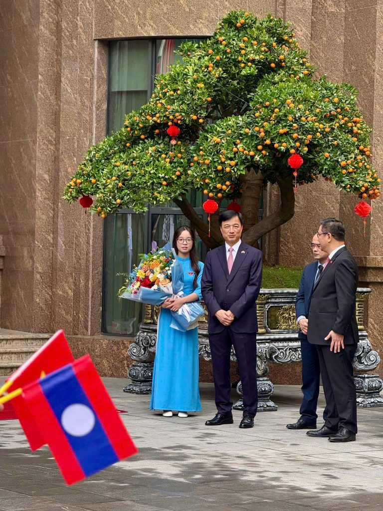 Đặc biệt, bạn Hoàng Hà Linh, sinh viên QH.2025 Khoa NN&VH Anh – Thủ khoa đầu vào toàn trường Đại học Ngoại ngữ – Đại học Quốc gia Hà Nội vinh dự được đại diện cho thế hệ trẻ thủ đô tặng hoa chúc mừng đồng chí Tổng Bí thư Ban Chấp hành Trung ương Đảng Nhân dân Cách mạng Lào, Chủ tịch nước Cộng hòa Dân chủ Nhân dân Lào Thongloun Sisoulith.